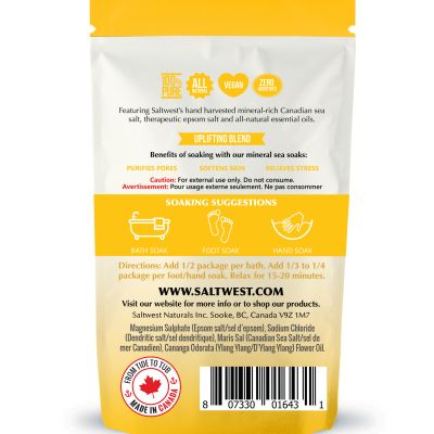 Uplifting Blend - Exotic Ylang Ylang Essential Oil will help to awaken the sensual self and benefits dry skin. Sit back, relax and soak away the day. Our mineral-rich Canadian Sea Salt will help soften your skin and Epsom Salts help to relieve minor aches & pains.