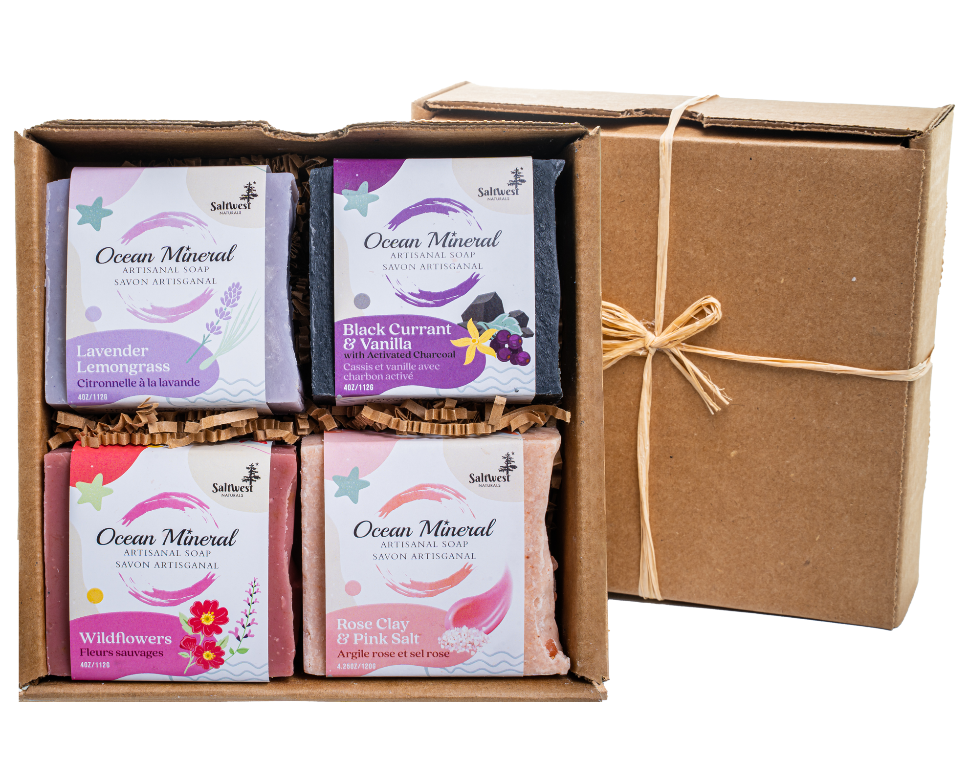 Gift Box Bundle includes - Lavender Lemongrass 3.75oz + Blackcurrant & Vanilla 3.75oz + Wildflowers 3.75oz + Rose Clay & Pink Salt 4oz