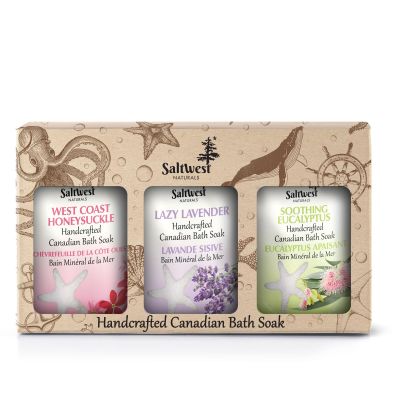Our West Coast inspired Bath Gift Box is a great gift for that special someone in your life. Our Rejuvenating Bath Set includes Black Currant & Vanilla Soak 80g, Orange Blossom & Honey Soak 80g, Palmarosa & Pink Grapefruit Soak 80g.