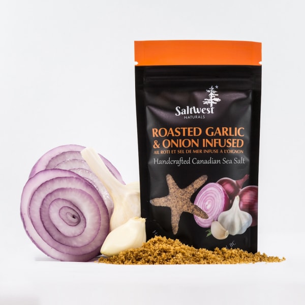 Our #1 infused flavour… One taste and you’ll know why people are raving about this Canadian sea salt. Using high quality garlic & onions, slowly roasting them to acheive a rich and sweet caramelized characteristic, which is infused into every grain. Perfect to season all meats and veggies. Sprinkle over some pan-fried prawns, sauteed mushrooms or roasted potatoes. Rub it on steak, chicken or pork and finish with some fresh herbs.